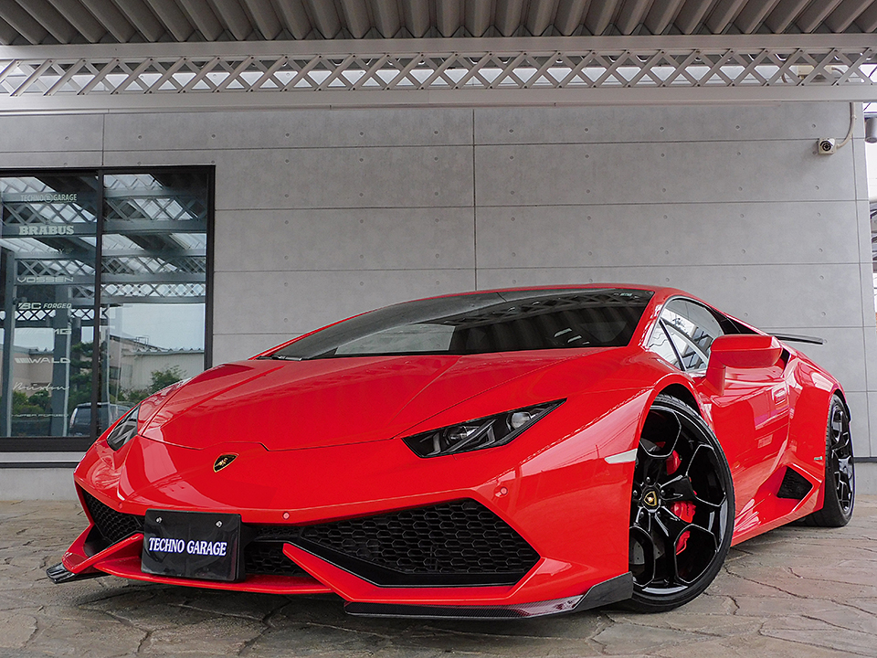 ランボルギーニウラカン LP610-4 フロントリフター カーボンエンジンベイ ガラスエンジンフード カーボンFスポイラー カーボンリヤウイング・LEAP DESIGN パワークラフト製可変バルブマフラー レッドブレーキキャリパー ブラックレザーシート フル電動パワーシート シートヒーター ブランディングパッケージ 前後パーキングセンサー バックカメラ 純正ナビ